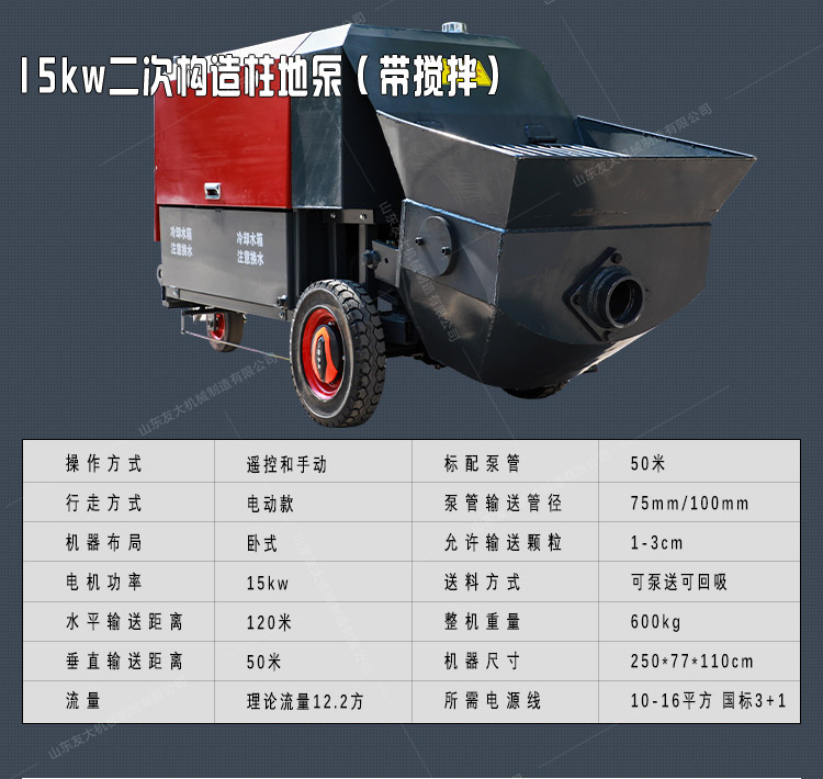 浇筑泵大大提高了施工效率,降低劳动强度,节约人工,被广泛应用。7.5kw手推式混凝土浇筑泵,手推式行走,具有搅拌功能,能够泵送机制砂,应用范围更广,更加方便使用。